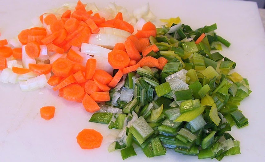 The next morning heat the pot back up slightly while you chop some leek leaves, a big onion, a couple of stalks of celery, and a couple of carrots. Soak some dried boletus edulis mushrooms (porcini in Italian and American, or cèpes in French) in hot water to rehydrate them. If you don't want to chop the mushrooms into smaller pieces for the soup, just put them right in to the broth without soaking them first. If you do soak the mushrooms, add the soaking liquid to the soup broth. Chopped, fresh button mushrooms would be good too, if you have them, with no soaking required.