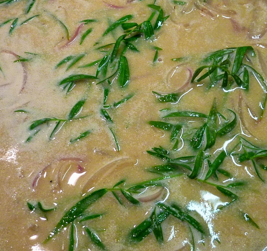 Add three six-inch sprigs of tarragon into the liquid, along with a quarter-cup of cream and a teaspoon or two of Dijon mustard. Another option is to put in a teaspoon or two of white wine vinegar instead of mustard, but I think the Dijon mustard is tastier. Simmer the sauce for five minutes so that the tarragon flavor will have time to develop. Don't forget to add some salt and pepper, to taste.