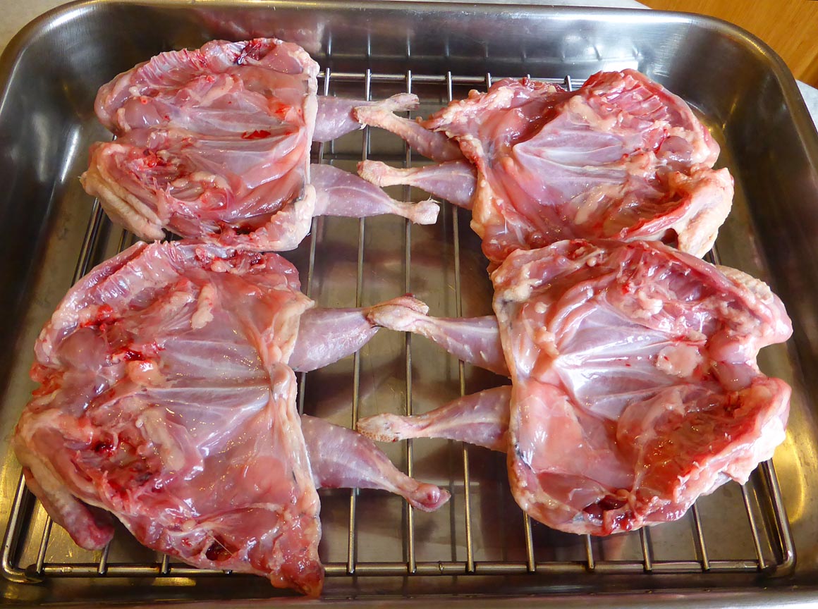 Each quail weighed in at about 250 grams, or a little over half a pound. Quail, by the way, are migratory birds that greatly resemble partridges but are much smaller. American quails are slightly larger than the Old World varieyy, but they are said to be excellent eating. As I mentioned, these quail were farm-raised — no buckshot in them. Besides having their heads still attached, they also needed further plucking to remove a lot of stray pinfeathers.
