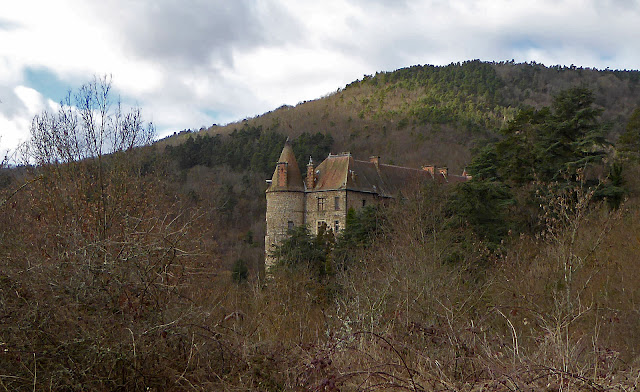 Walt and I drove up there from our gîte on my birthday, three days before we ended up in Retournac. CHM had told us about the château, so we wanted to see it. We were pretty tired after a long day, the day before, of packing up the car and then driving for about five hours in gusty and rainy weather to get from Saint-Aignan to our gîte in Le Puy. We got these views of the place from the opposite bank of the river.