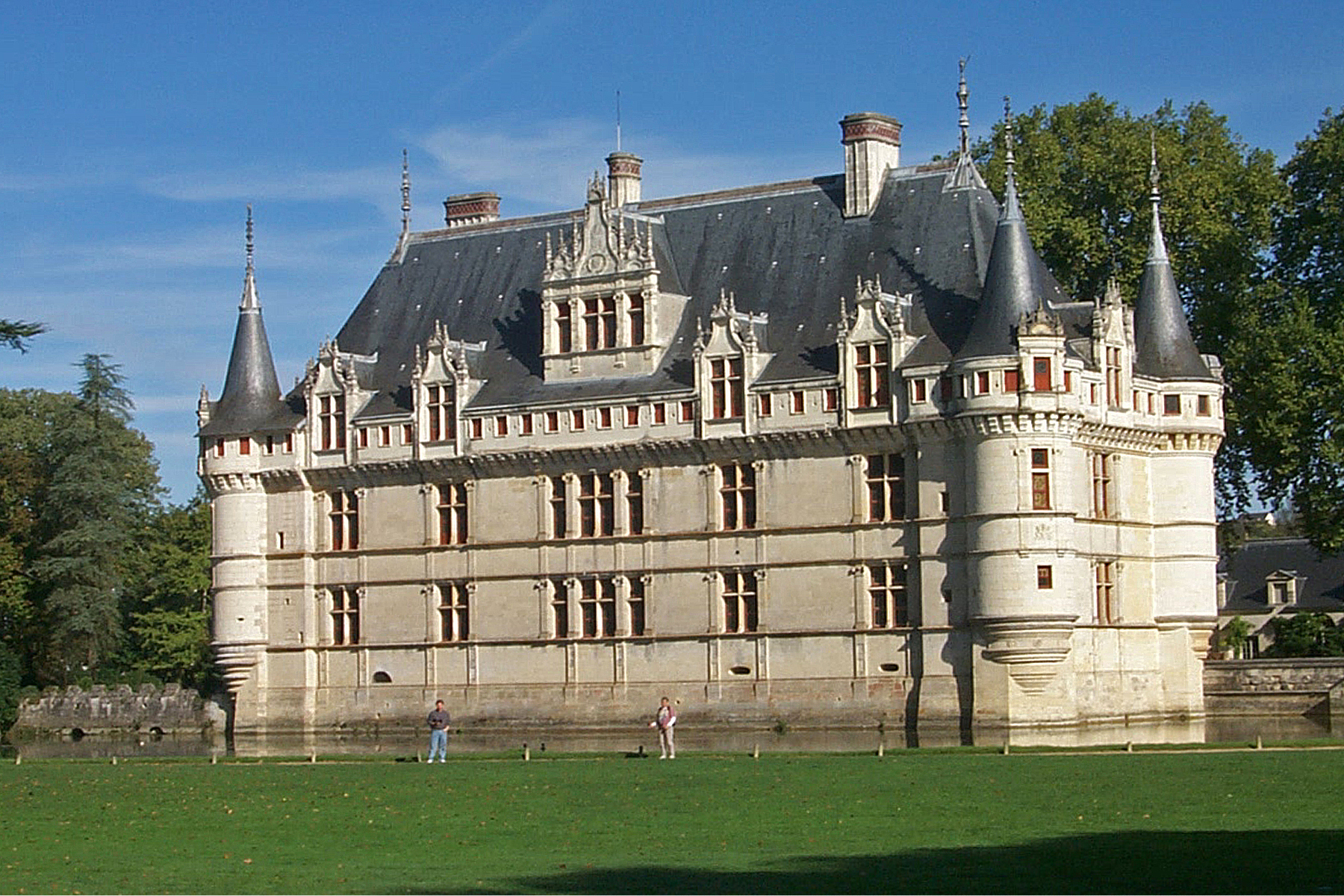The Château d'Azay-le-Rideau was built starting in 1518, about the same time as another grand Loire Valley monument, the Château de Chambord. An earlier building on the site had been burned down in 1418 by the forces of the French king Charles VII. You can see how massive the Renaissance-era building actually is if you notice that Walt and our friend Sue are standing in front of it in the photo above. Enlarge it and examine it carefully. Walt and Sue look really tiny.
